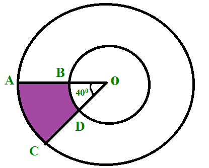 Find the area of the shaded region of the given picture.If the radius of the the two concentric circles with center O are 7 cm and 14 cm respectively and angle <AOB = 40°.