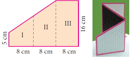 The parallel sides of the combined trapezium (I and II) are 5 cm and 16 cm and its height, h = 8 + 8 = 16 cm, length of the rectangle (III) = 16 cm and its breadth = 8 cm.