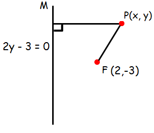 Find the equation of the parabola whose focus and directrix is (2, -3) and 2y - 3 = 0 respectively