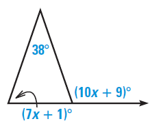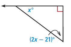 11) In a triangle ABC, ∠ A = 2X+7, ∠ B = 5X-15, and ∠ C = 6X. What is the value of x and what are the measures of angles A, B, and C?