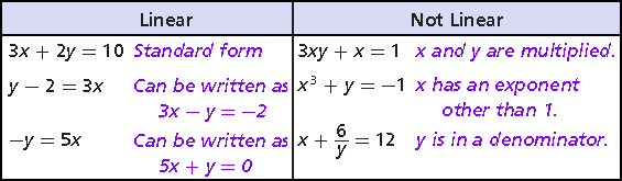 Another way to determine whether a function is linear is to look at its equation. A function is linear if it is described by a linear equation. A linear equation is any equation that can be written in the standard form shown below.