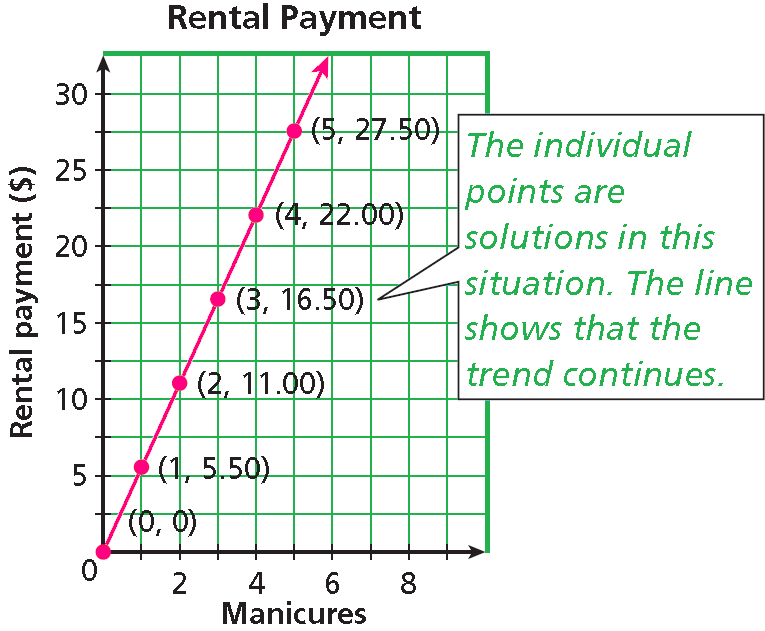 Sometimes domain and range are restricted even further to a set of points. For example, a quantity such as number of people can only be whole numbers. When this happens, the graph is not actually connected because every point on the line is not a solution. However, you may see these graphs shown connected to indicate that the linear pattern, or trend, continues.