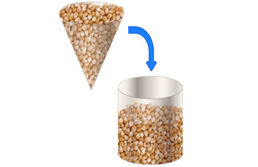 To explore the volume of a cone, Alexa does an experiment with a cone and a cylinder that have congruent bases and heights. She fills the cone with popcorn kernels and then pours the kernels into the cylinder as shown in the figure.
