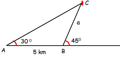 Two soldiers A and B in two different underground bunkers on a straight road, spot an intruder at the top of a hill. The angle of elevation of the intruder from A and B to the ground level in the eastern direction are 30° and 45° respectively. If A and B stand 5km apart, find the distance of the intruder from B.