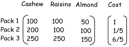 By multiplying the above matrices, we may get the cost of each pack.