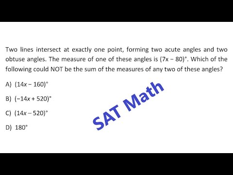 Two lines intersect at exactly one point, forming two acute angles and two obtuse angles. The measure of one of these angles is (7x − 80)°. Which of the following could NOT be the sum of the measures of any two of these angles?