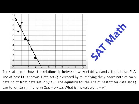 The scatterplot shows the relationship between two variables, x and y, for data set P. A line of best fit is shown. Data set Q is created by multiplying the y-coordinate of each data point from data set P by 4.3. The equation for the line of best fit for data set Q can be written in the form Q(x) = a + bx. What is the value of a – b?