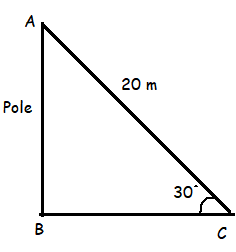 A circus artist is climbing a 20 m long rope, which is stretched and tied from the top of a vertical pole to the ground.Calculate the height of the pole, if the angle created by the rope with the ground level is 30°.