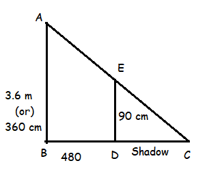 A boy of height 90 cm is walking away from the base of a lamp-post at a speed of 1.2 m/s.The lamp is 3.6 m above the ground level, find the length of her shadow after 4 seconds.