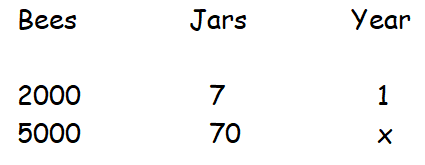 A group of 2000 bees can make 7 jars of honey in one year. How long will it take for 5000 bees to make 70 jars of honey (in years) ?