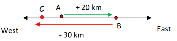 James goes 20 km towards east from a point A to the point B. From B, he moves 30 km towards along the same road. If the distance towards east represents a positive integer then, how will you represent the distance traveled towards west?