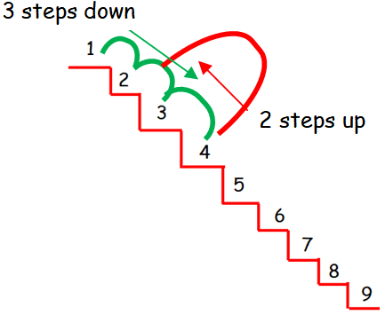 2nd jump = 4 – 2 = 2 steps 4th jump = 5 – 2 = 3 steps 6th jump = 6 – 2 = 4 steps 8th jump = 7 – 2 = 5 steps 10th jump = 8 – 2 = 6 steps |