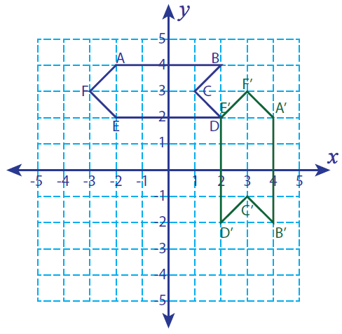 A'(4, 2) , B'(4, -2), C'(3, -1), D'(2, -2), E'(2, 2), F'(3, 3)