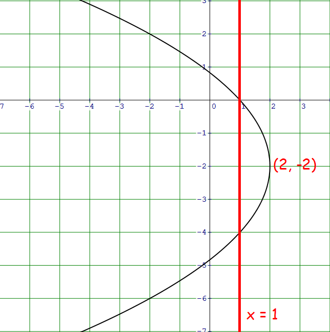 Plot the vertex (2, -2) and latus rectum x = 1 on the xy-plane.