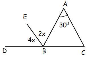 In the figure above, point B is on the line segment DC. If AB = BC, what is the measure of the angle ABE ?