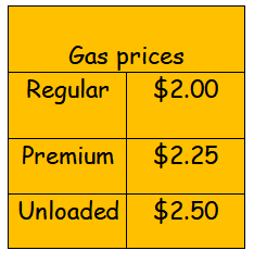 (19) The prices in the table given below show the different types of gas offered at a gas station and the prices of gas per gallon. If Emily has $50, what is the least amount of gas, in gallons, she can purchase subtracted from the greatest amount of gas, in gallons, she can purchase ?