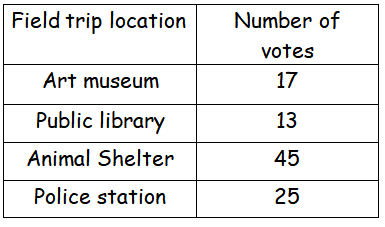 (13) Jessica asked 100 third graders at her school where they want to go on the next school field trip. The table shows the results.