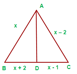 (iii) If AB = x, AC = x – 2 cm, BD = x + 2 cm and DC = x – 1 find the value of x
