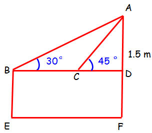 A student sitting in a classroom sees a picture on the black board at a height of 1.5 m from the horizontal level of sight. The angle of elevation of the picture is 30°. As the picture is not clear to him, he moves straight towards the black board and sees the picture at an angle of elevation of 45°. Find the distance moved by the student.