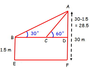 A boy is standing at some distance from a 30 m tall building and his eye level from the ground is 1.5 m. The angle of elevation from his eyes to the top of the building increases from 30° to 60° as he walks towards the building. Find the distance he walked towards the building.
