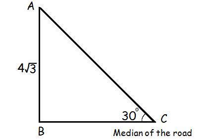 A road is flanked on either side by continuous rows of houses of height 4√3 m with no space in between them. A pedestrian is standing on the median of the road facing a row house. The angle of elevation from the pedestrian to the top of the house is 30° . Find the width of the road.