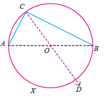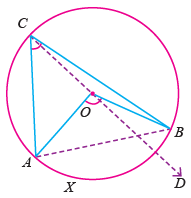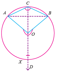O is the centre of the circle. AXB is the arc. AOB is the angle subtended by the arc AXB at the centre. <ACB is the angle subtended by the arc AXB at a point on the remaining part of the circle |