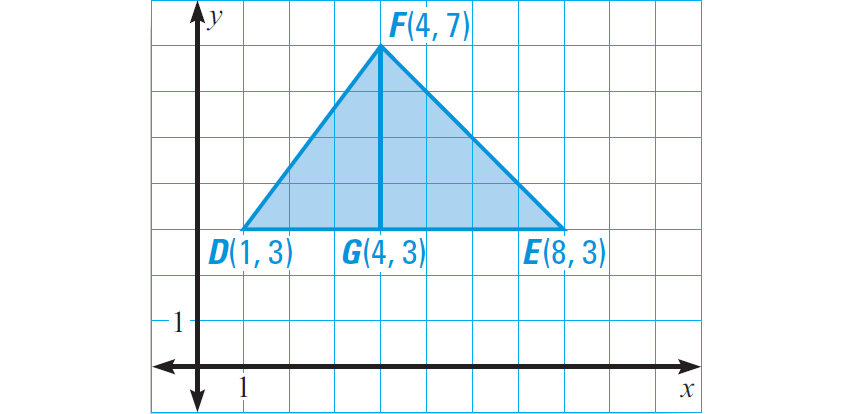 Plot the points in the coordinate plane. Draw the height from F to the side DE. Label the point where the height meets DE as G. Point G has coordinates (4, 3).