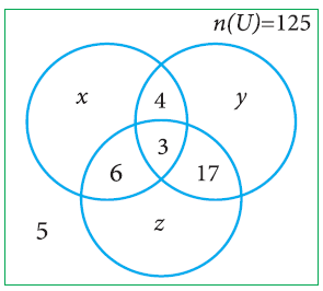 (11) In the adjacent diagram, if n(U) = 125 , y is two times of x and z is 10 more than x, then find the value of x ,y and z.