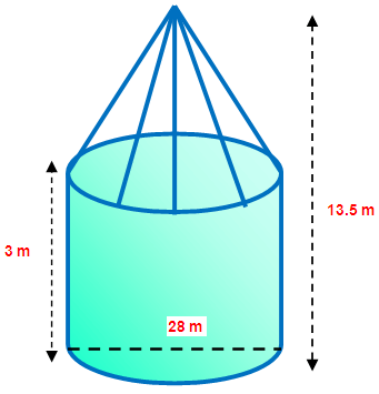 A tent is in the shape of right circular cylinder surmounted by a cone. The total height and diameter of the base are 13.5 m and 28 m. If the height of the cylindrical portion is 3 m, find the total surface area of the tent.