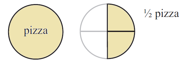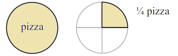 Fraction is the way in which we are writing parts of a whole number. For example if we take a pizza, and divide it up equally between 4 people, each person will have 1/4 or, written in words, one quarter of the pizza.