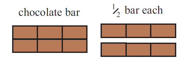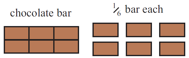 Some chocolate bars can conveniently be marked to make them easier to break into pieces to eat. For instance, you can have a bar marked into 6 equal pieces, so each piece is 1/6, or one sixth of the whole bar. So if you share this bar between 6 people, each person gets 1 piece each.