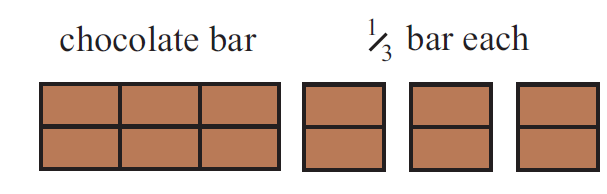 1/3 = 1 ÷ 3 = 1 whole bar of chocolate divided into 3 pieces