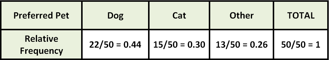 A survey is conducted among school students. 50 students are randomly selected and they are asked, whether they prefer dogs, cats or other pets. Convert this table to a relative frequency table that uses decimals as well as one that uses percents.