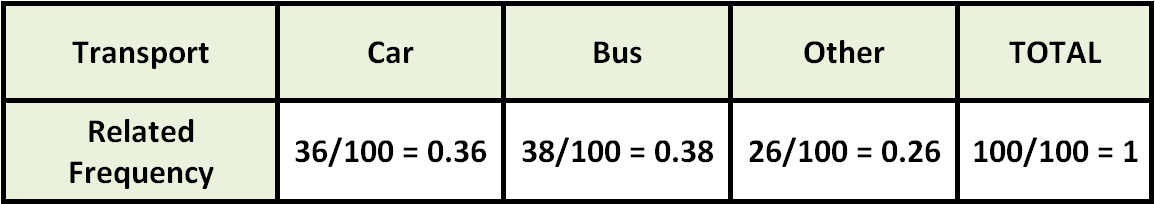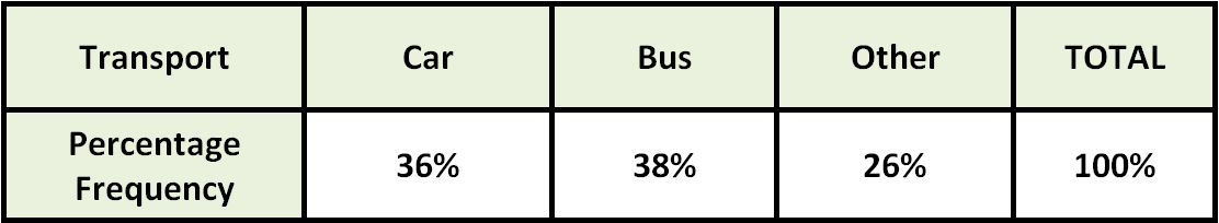 100 students in a middle school are asked, how they travel to school. The table given below shows the different types of transport they use and their corresponding frequencies. Convert this table to a relative frequency table that uses decimals as well as one that uses percents.
