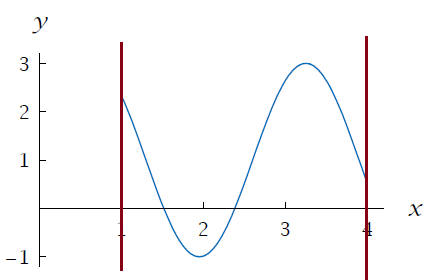 The vertical line intersects the x-axis at the points 1 and 4.