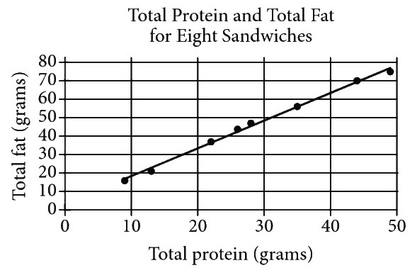 The scatterplot above shows the numbers of grams of both total protein and total fat for eight sandwiches on a restaurant menu. The line of best fit for the data is also shown. According to the line of best fit, which of the following is closest to the predicted increase in total fat, in grams, for every increase of 1 gram in total protein?