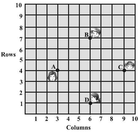 (5) In a classroom 4 friends are seated at the points A, B, C and D as shown in figure. Champa and Chameli walk into the class and after observing for a few minutes champa asks Chameli,"Don't you think ABCD is a square?" Chameli disagrees. Using distance formula, find which of them is correct.