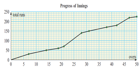 The graph below shows the progress of the batting team in a game of cricket. It shows the runs accumulated at the times when the batsmen were given ‘out’.