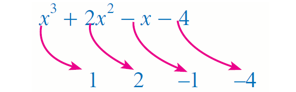 Arrange the dividend and the divisor according to the descending powers of x and then write the coefficients of dividend in the first row (see figure). Insert 0 for missing terms.