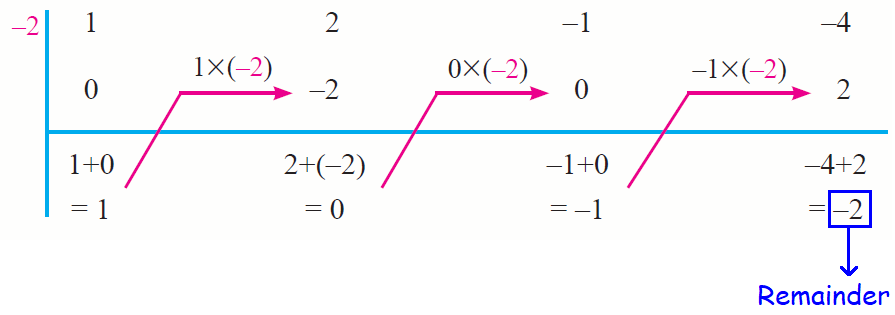 In the above synthetic division. zero of the divisor is -2 and the remainder is -2.