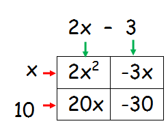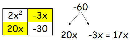 2x2 + 17x - 30 = (x + 10)(2x - 3)