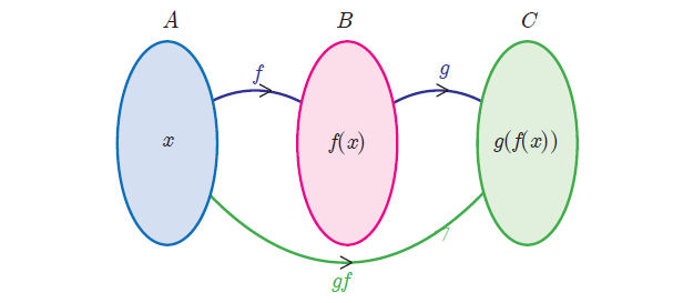 Let f : A ----> B and g : B ----> C be two functions. Then the composition of f and g denoted by g o f is defined as the function g o f(x) = g[f(x)] for all x ∈ A.