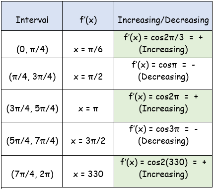 (0, π/4), (π/4, 3π/4), (3π/4, 5π/4), (5π/4, 7π/4)