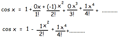 cos2x = 1 + (0x)/1! + (-2)x2/2! + 0x3/3! + 8x4/4! +.......