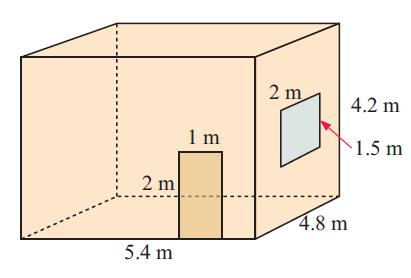 A lounge room is 5.4 m long, 4.8 m wide, and 4.2 m high. It has a door 2 m by 1 m and a window 2 m by 1.5 m.