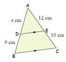 AD = x cm, DB = 9 cm, AE = 12 cm, EC = 10 cm