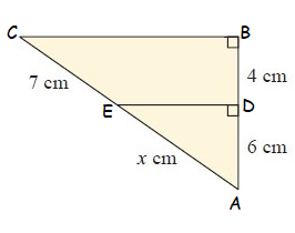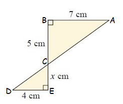 AB = 7 cm, BC = 5 cm, DE = 4 cm, EC = x cm