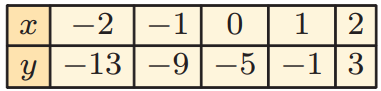 So, the points are (-2, -13) (-1, -9) (0, -5) (1, -1) and (2, 3). By plotting the points in the graph, we get