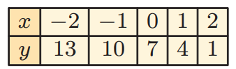 So, the points are (-2, 13) (-1, 10) (0, 7) (1, 4) and (2, 1).. By plotting these point in the graph, we get