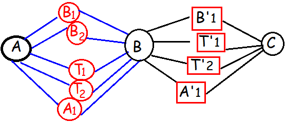 If we choose the transportation bus from place A to B, we have to choose either train or air, to go from B to C.